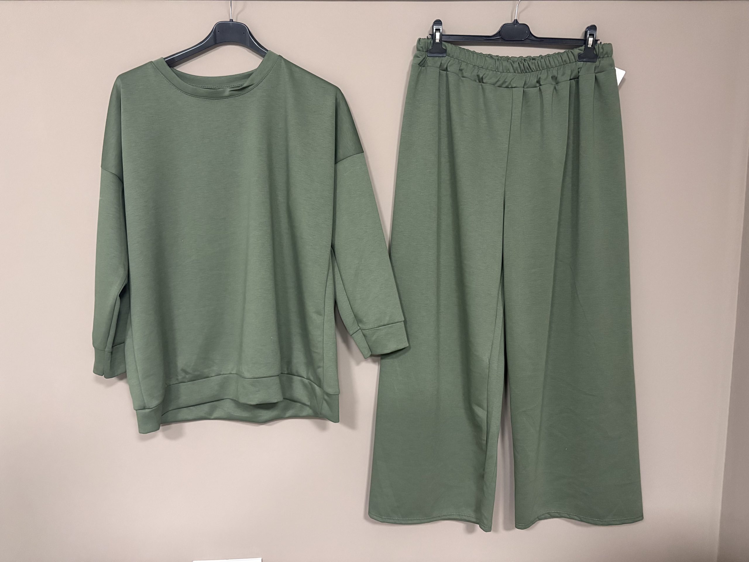 Pantalón: Modelo ancho y recto (wide leg), tiro medio-alto con cintura elástica cómoda y ajuste adaptable. Pierna amplia desde la cadera hasta el tobillo, con apertura generosa que estiliza la silueta y da libertad total de movimiento. Bajo recto sin puño (o con ligero ribete según modelo), ideal para usar con zapatillas o botas.