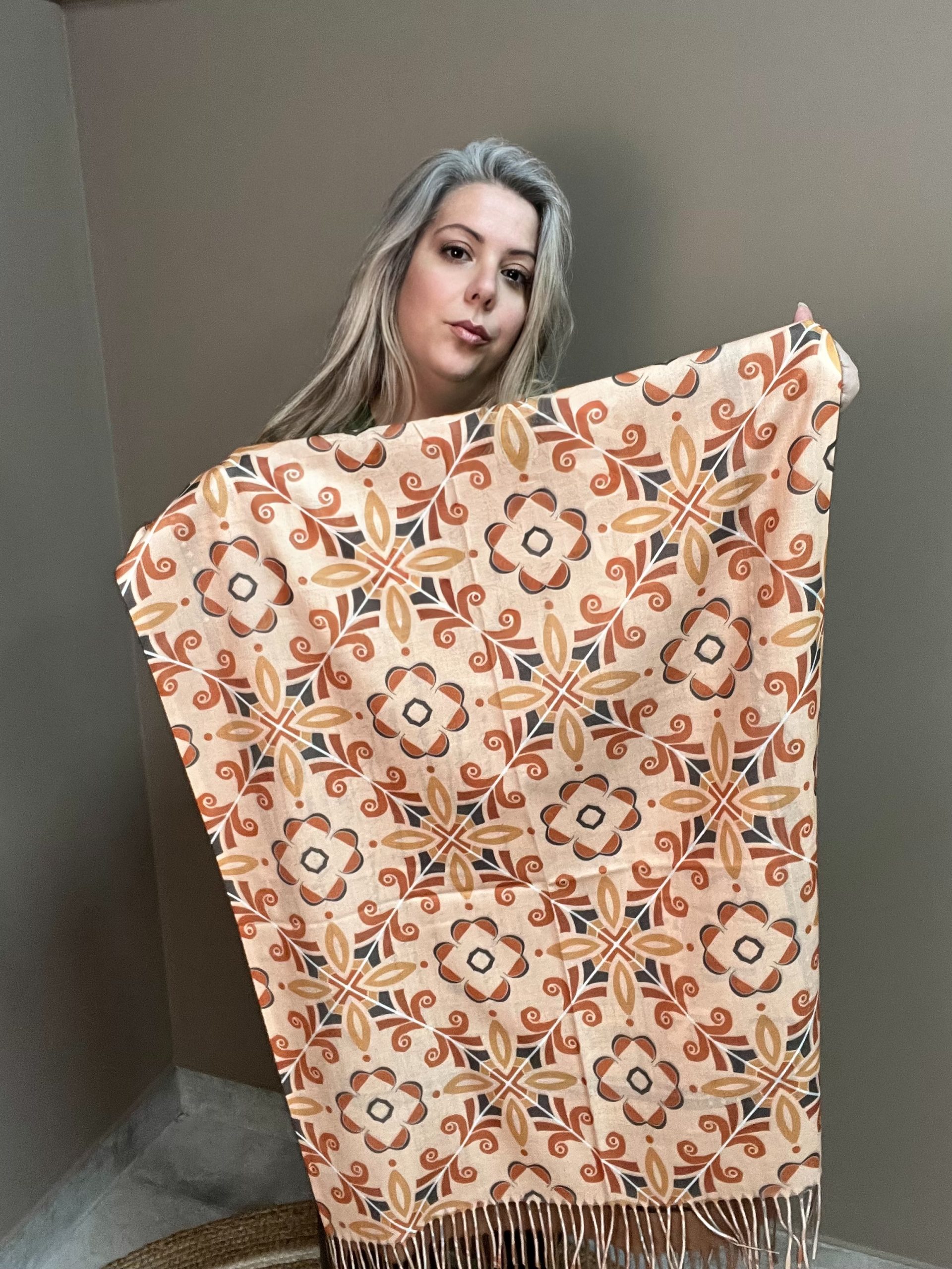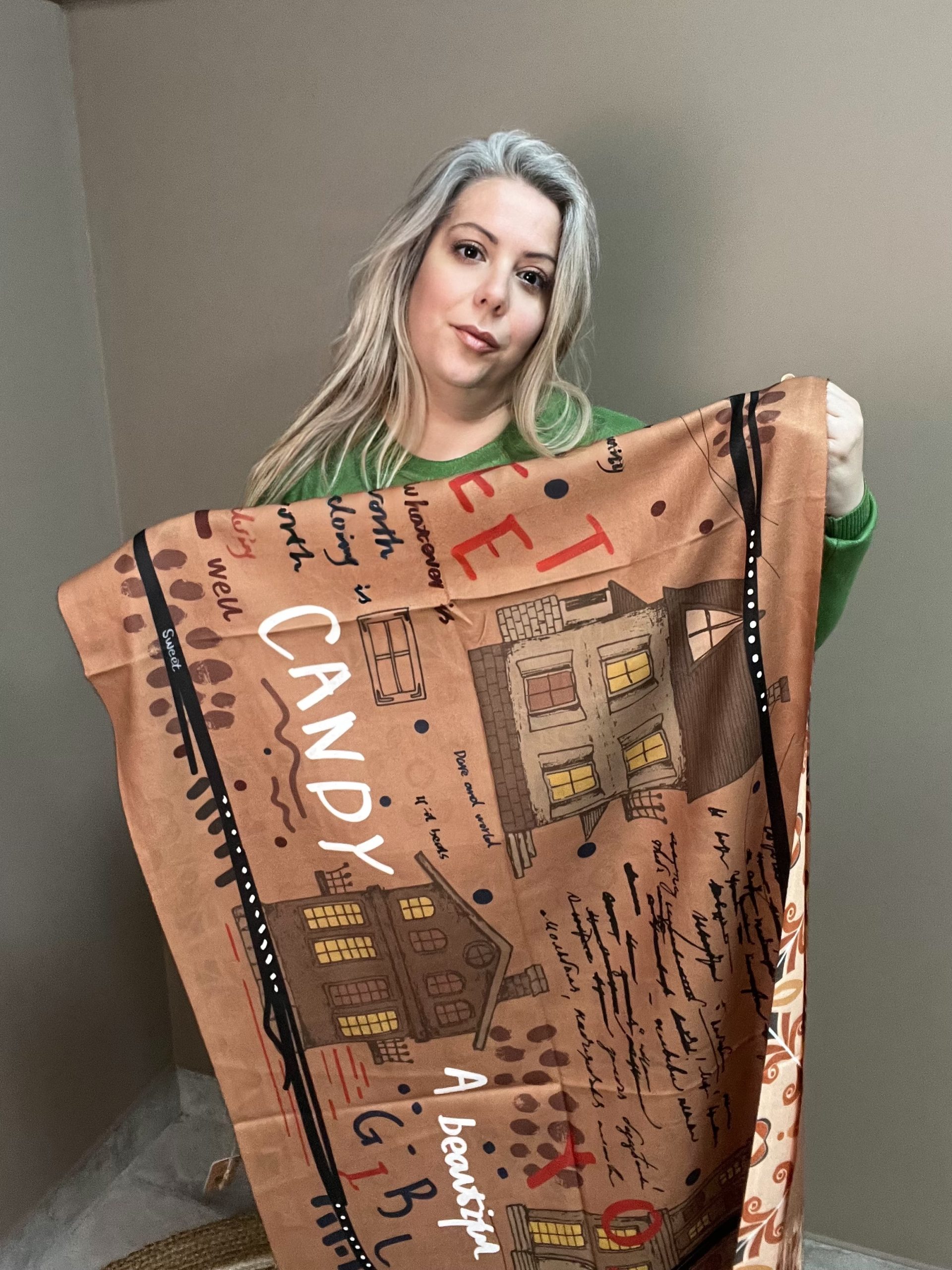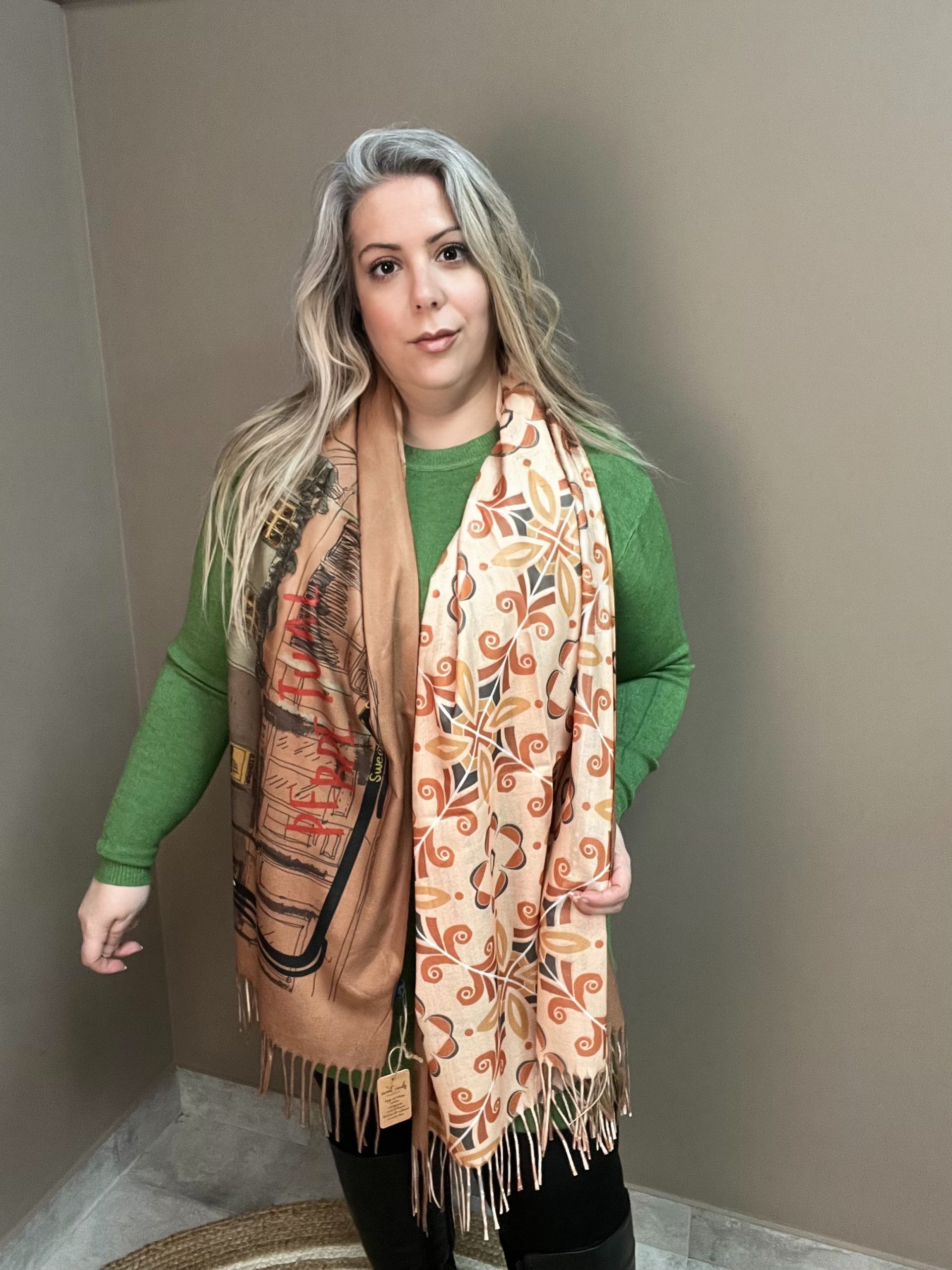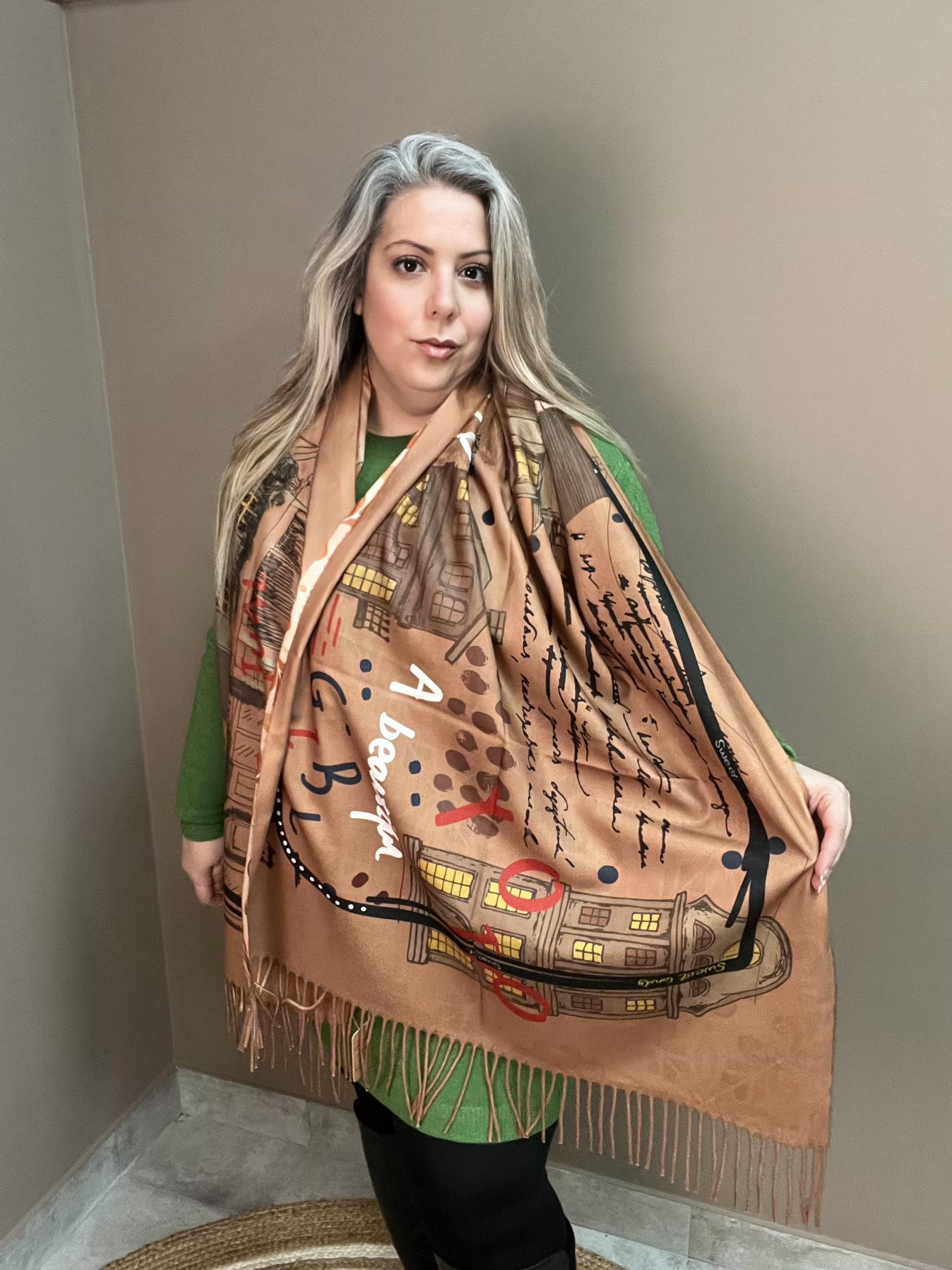 ¡Exclusivo Candi reversible! Pañuelo bufanda con estampado doble: lado artístico de fachadas y escritura manuscrita en camel, negro y pops de color. Lado reverso sorpresa. Flecos premium, ideal para looks diarios o especiales.