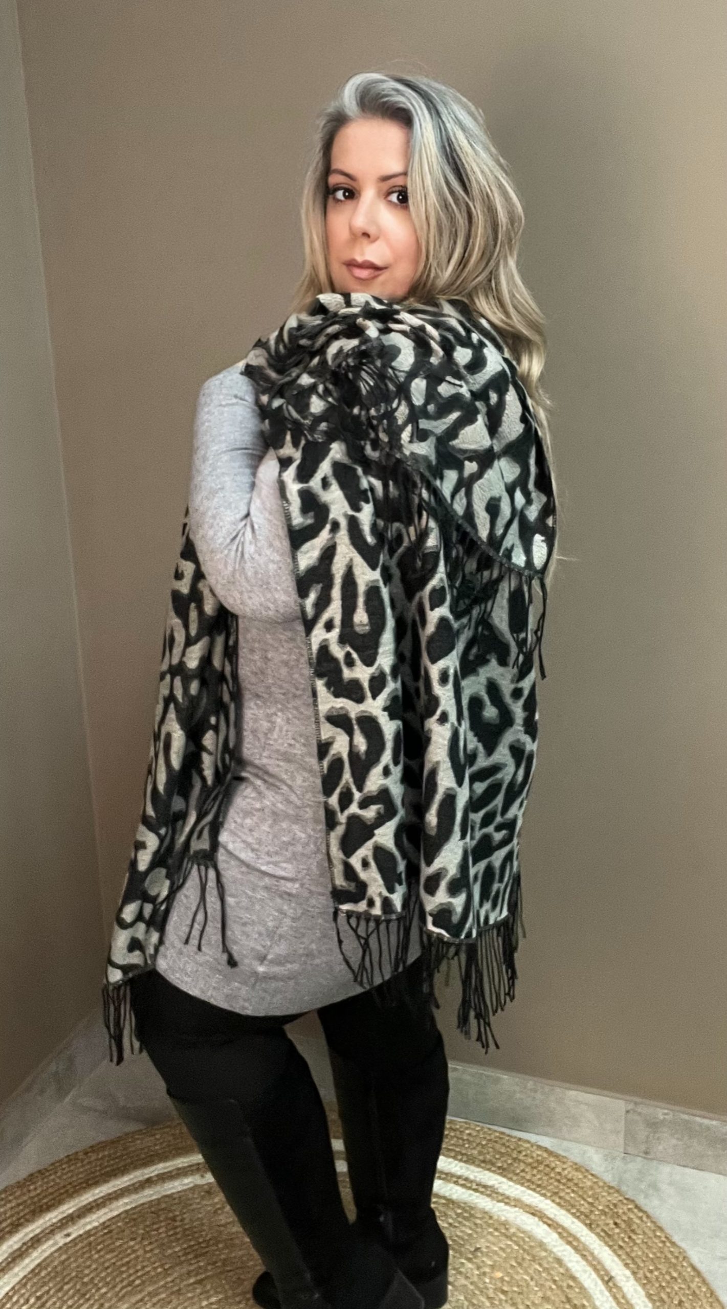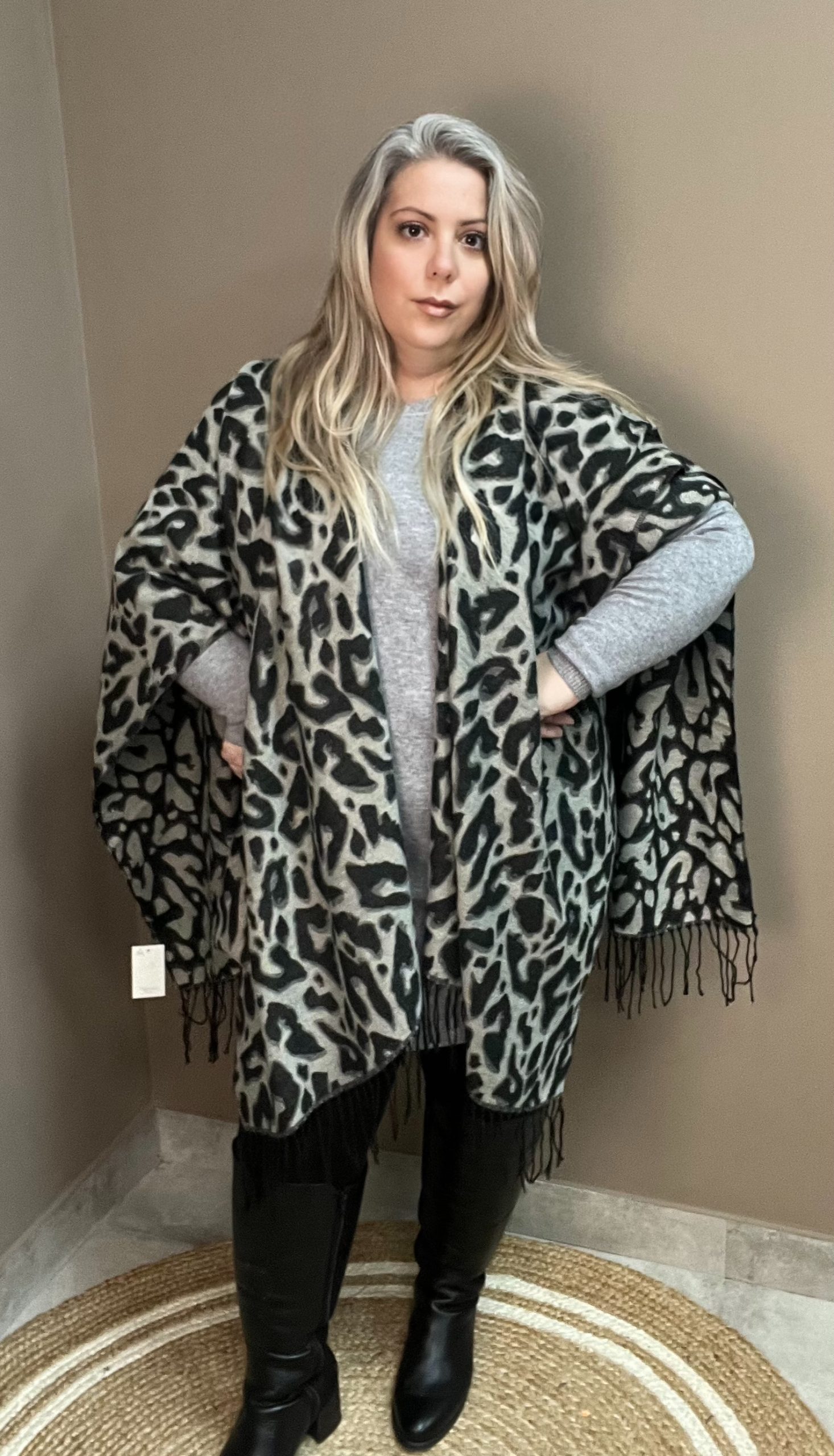 ¡Tendencia absoluta! Capa pañuelo de cachemira con print leopardo negro y gris, flecos largos y tacto súper suave. Perfecta para elevar tus looks de diario o noche.